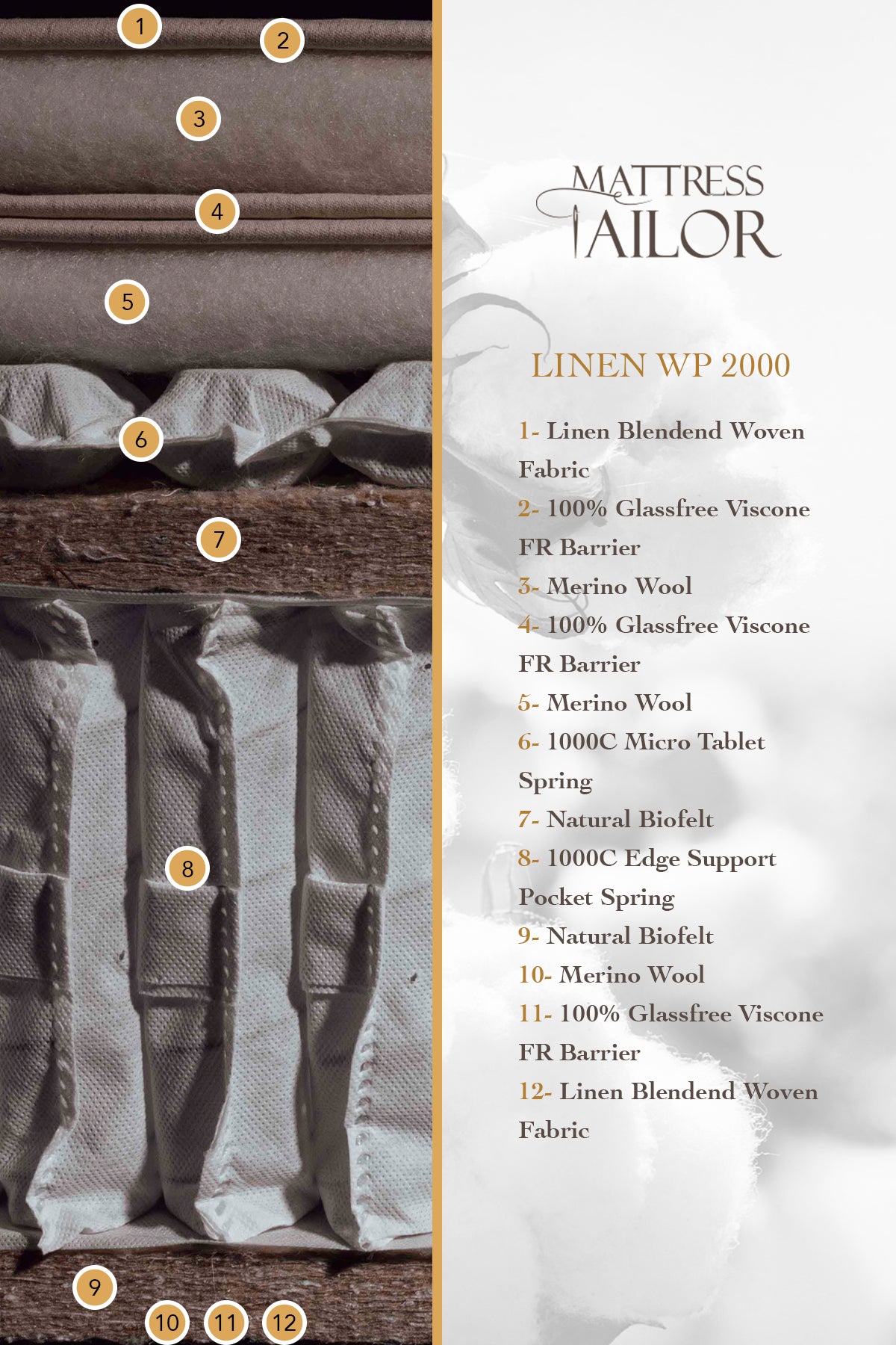 - Healthy, Comfortable, Uninterrupted Sleep: Thanks to the unique structure of its wool layer, LINEN WP 2000 ensures your body can breathe freely. Its linen fabric cover, made from natural fibers, combines strength with softness, delivering a smooth and comfortable experience. Whether it's the cold winter months or scorching summer days, LINEN WP 2000 creates the ideal atmosphere for your body with each layer.